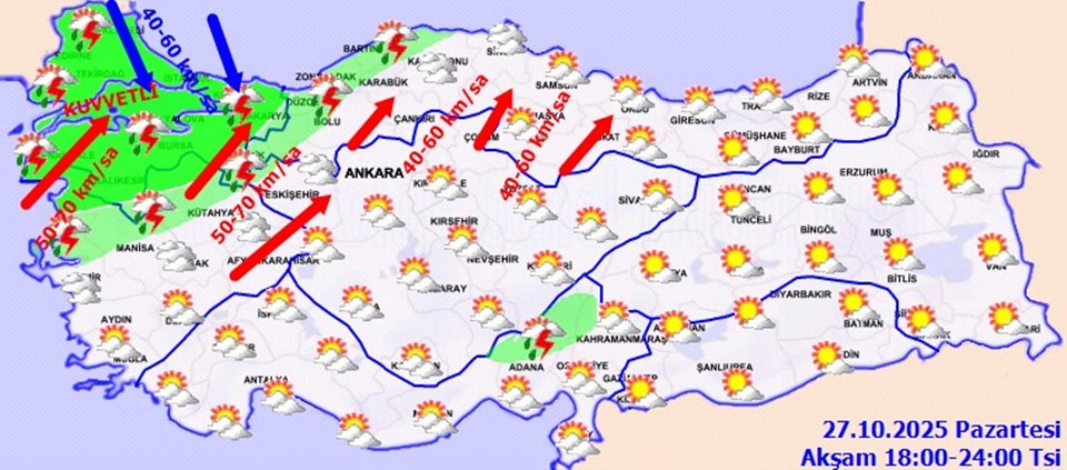 Meteoroloji Genel Müdürlüğü’nün (MGM) verilerine göre Marmara ve Ege ile İç Anadolu’nun kuzey ve batı, Karadeniz’in iç kesimlerinde saatteki hızı 70 kilometreye ulaşacak fırtına bekleniyor.