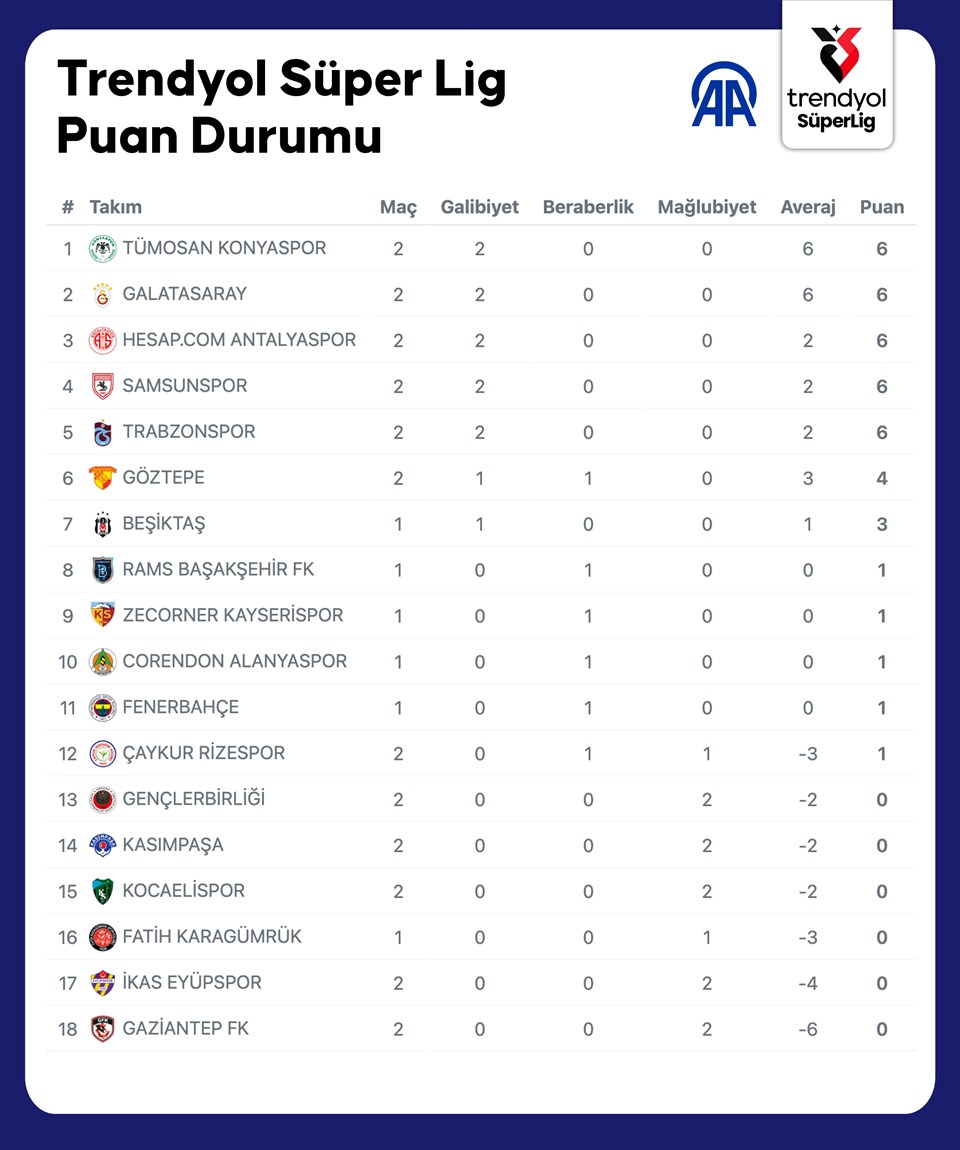 Süper Lig’in ikinci haftasında şampiyonluk adaylarından biri takıldı. Galatasaray, Beşiktaş ve Trabzonspor hata yapmadı, Fenerbahçe ise Göztepe ile berabere kaldı.
