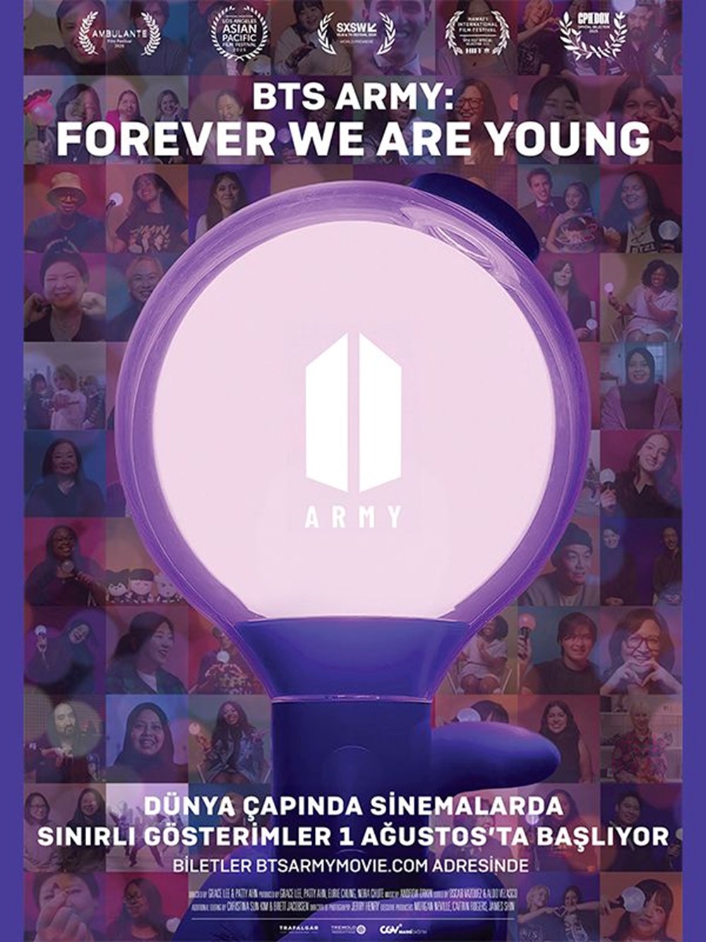 Patty Ahn ve Grace Lee’nin yönettiği “BTS Army: Forever We Are Young”, dünyaca ünlü k-pop grubu BTS’nin müziğini ve grubun kendini adamış hayran kitlesi olan BTS Army’yi anlatıyor.