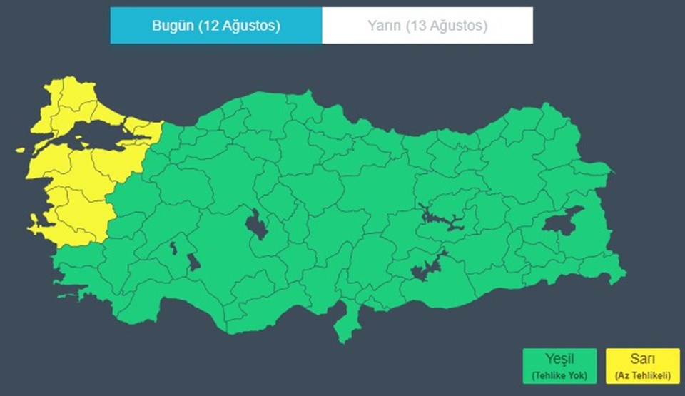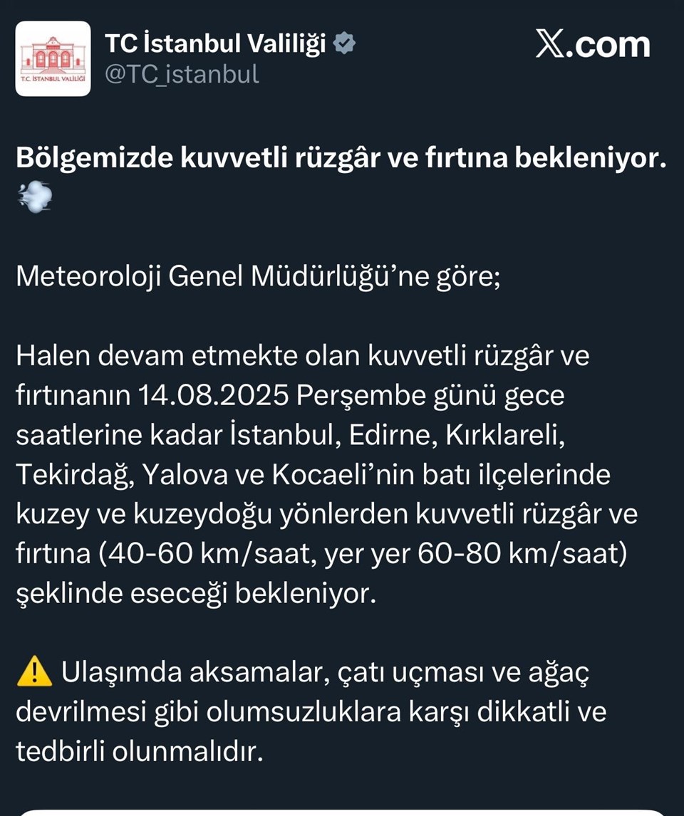 Yapılan açıklamada, “Bölgemizde kuvvetli rüzgar ve fırtına bekleniyor. Meteoroloji Genel Müdürlüğü’ne göre; halen devam etmekte olan kuvvetli rüzgar ve fırtınanın 14 Ağustos Perşembe günü gece saatlerine kadar İstanbul, Edirne, Kırklareli, Tekirdağ, Yalova ve Kocaeli’nin batı ilçelerinde kuzey ve kuzeydoğu yönlerden kuvvetli rüzgâr ve fırtına (40-60 km/saat, yer yer 60-80 km/saat) şeklinde eseceği bekleniyor. Ulaşımda aksamalar, çatı uçması ve ağaç devrilmesi gibi olumsuzluklara karşı dikkatli ve tedbirli olunmalıdır” ifadelerine yer verildi.