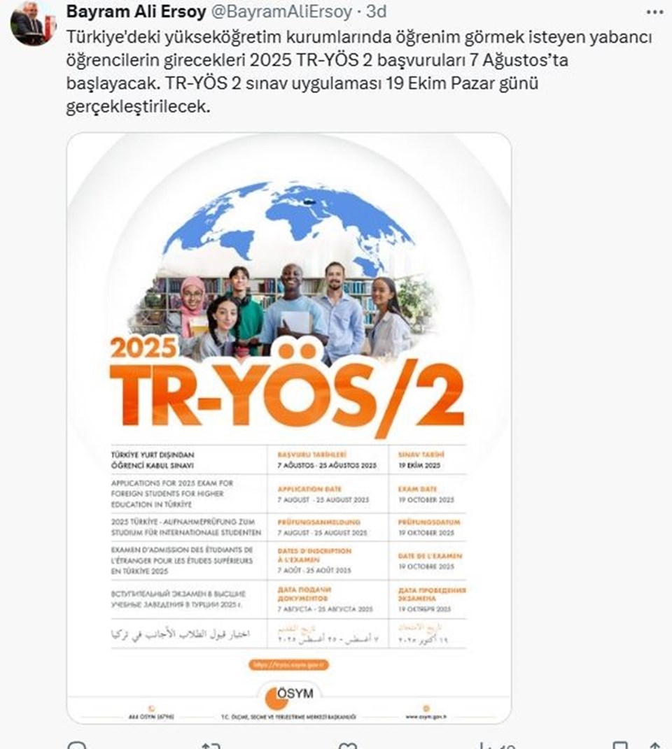 ÖSYM Başkanı Bayram Ali Ersoy’dan TR-YÖS 2 başvurularına yönelik açıklama geldi. Yapılan açıklamaya göre, Türkiye’deki yükseköğretim kurumlarında öğrenim görmek isteyen yabancı öğrencilerin girecekleri 2025 TR-YÖS 2 başvuruları 7 Ağustos’ta başlayacak. TR-YÖS 2 sınav uygulaması 19 Ekim Pazar günü gerçekleştirilecek.