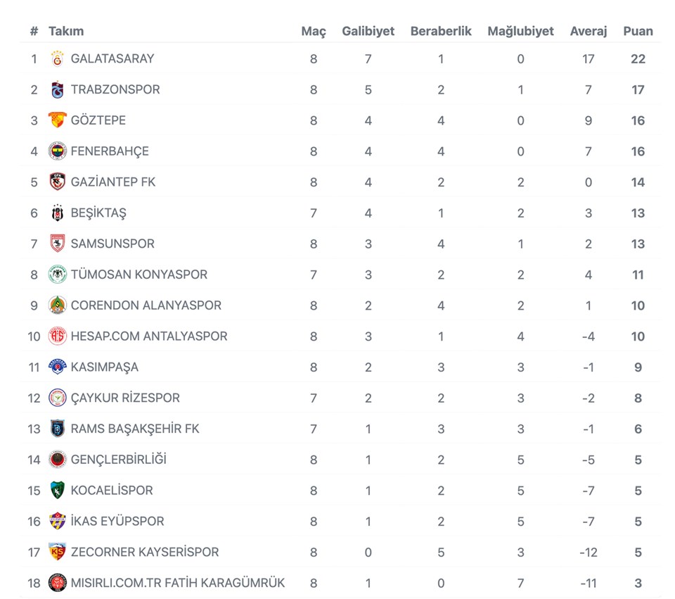 8 hafta sonunda lider Galatasaray ile 16 puanlı takımlar Göztepe ve Fenerbahçe, namağlup ekipler olarak dikkati çekti.