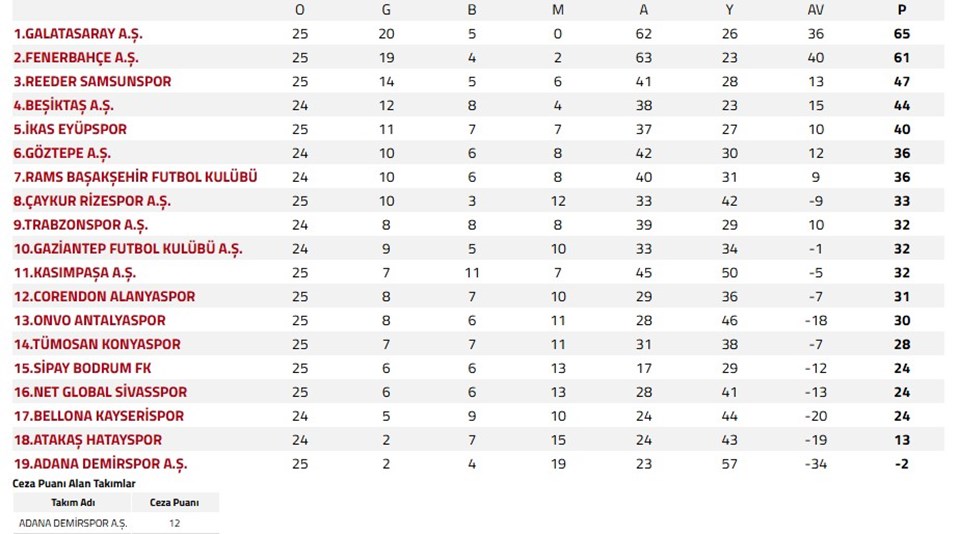 SÜPER LİG GÜNCEL PUAN DURUMU
